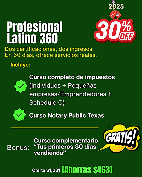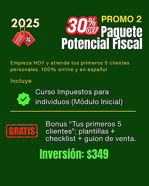 PaqueteAprovecha nuestra OFERTA NAVIDAD y obten un 30% de descuento. Comienza hoy con un método claro y 100 % online. Incluye: Curso Impuestos para individuos (Módulo Inicial) + Bonus “Primeros 5”: plantilla + checklist + guion de venta.