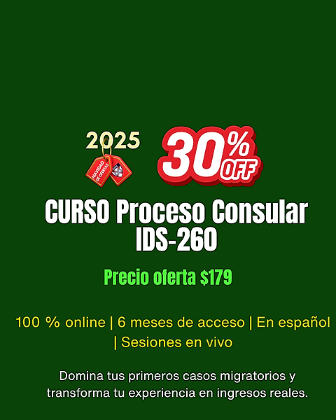 Paquete¿Te pierdes entre NVC, tiempos y requisitos? Ordena el proceso y atiende tu primer caso consular con un método claro y plantillas listas. Incluye: • Curso Proceso consular DS-260 (100% online con acceso ilimitado por 6 meses, en español y con 2 sesio